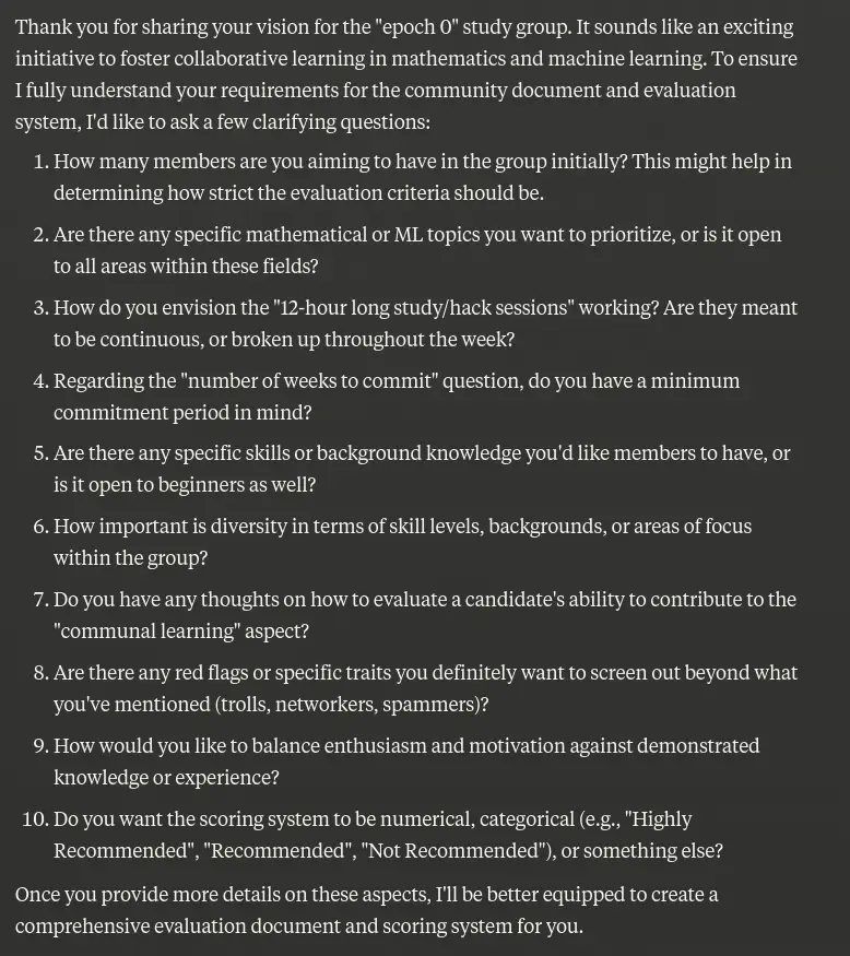 i wrote a “spec” for what i want epoch 0 to look like and then used claude to help me think through how i should evaluate the form entries.