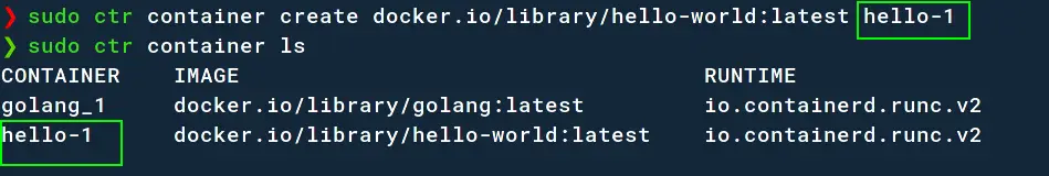 sudo ctr container create docker.io/library/hello-world:latest hello-1
