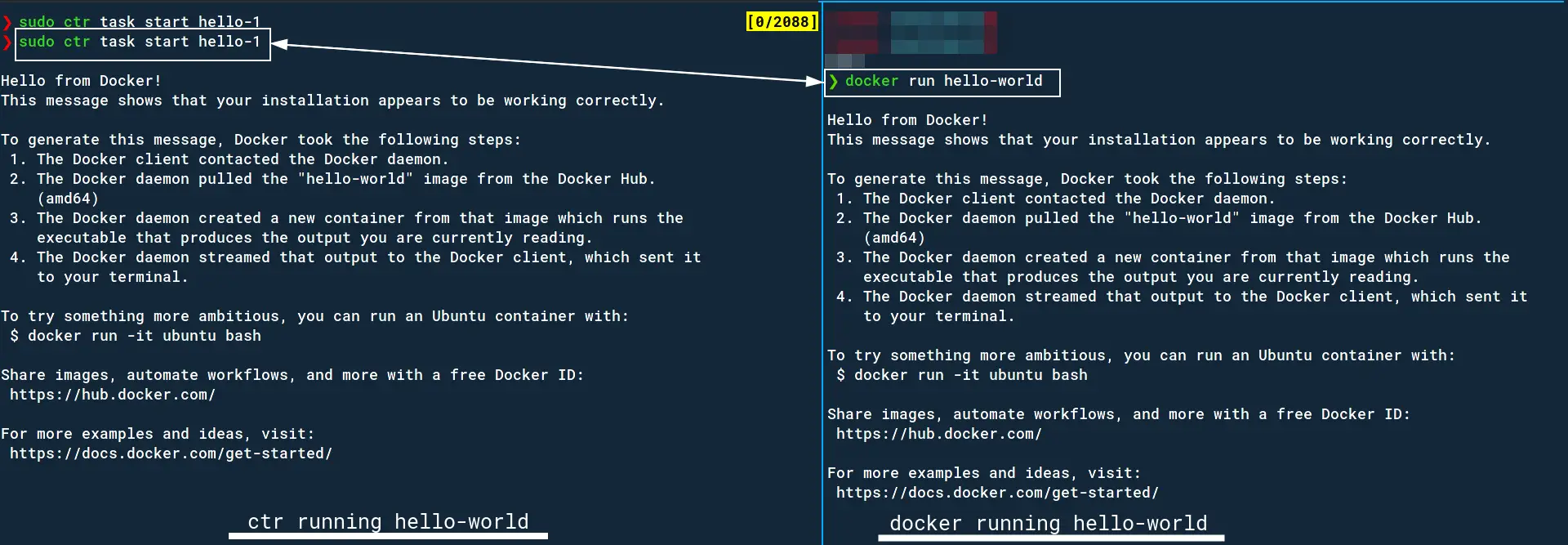 sudo ctr task start hello-1The result is that we see docker’s default hello-world container running! Notice how many more steps we had to follow to get this hello-world image, and then running it as compared to docker. That’s because as you go lower the abstraction layer you get more power but also more responsibility (of doing more work to achieve the same thing).