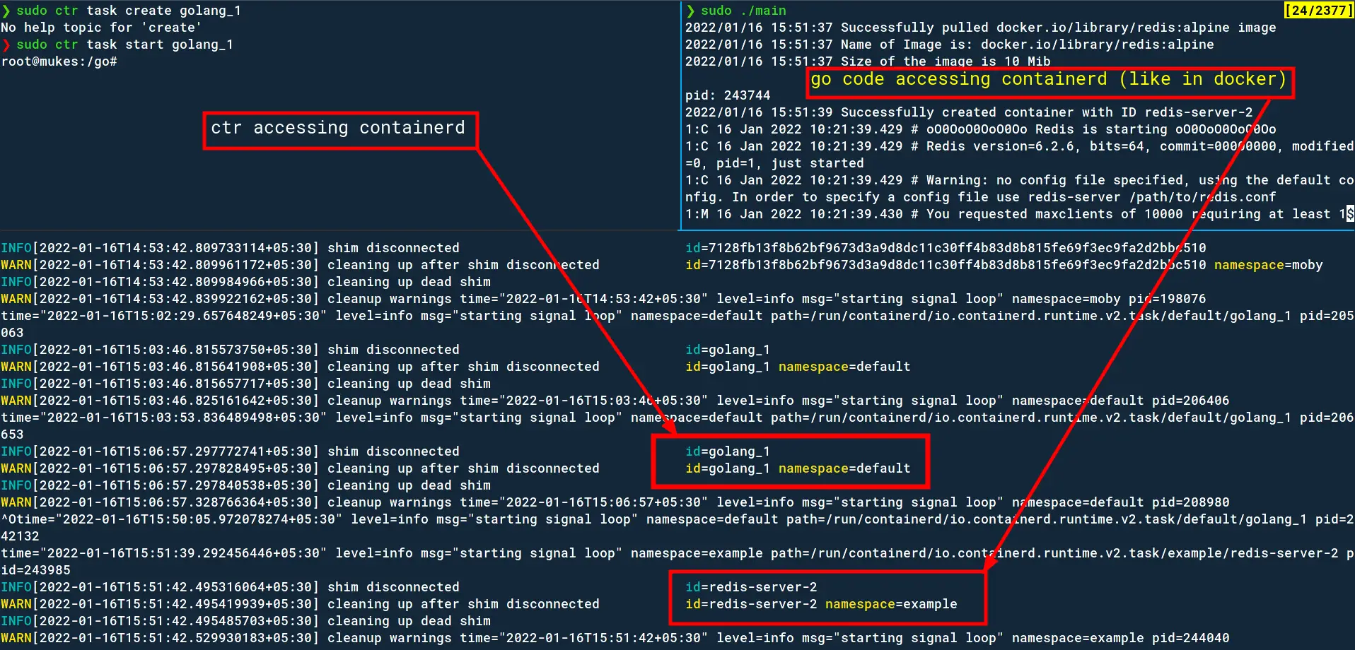 As a bonus, go to the terminal where your containerd was running to see its debug outputs while you create and execute containers.